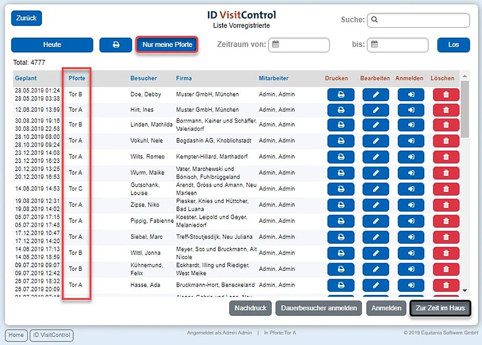 Mit dem Zusatzmodul Eingangstrennung, kann im Modul Intranet der Besuchersoftware ID VisitControl, eine Aktivierung zur individuellen Eingangs- und Pfortenauswahl vorgenommen werden. Sollten mehrere Pforten bzw. Eingänge innerhalb eines Unternehmens existieren, kann für jede Vorregistrierung ein Eingang ausgewählt werden, an welcher die Ankunft des Besuchers erwartet wird. Sie sehen alle vorregistrierten Besuche, nicht nur die für Ihre Pforte, sondern für alle weiteren Eingänge in Ihrem Unternehmen.
